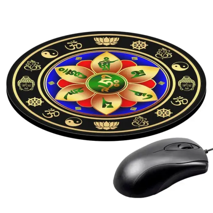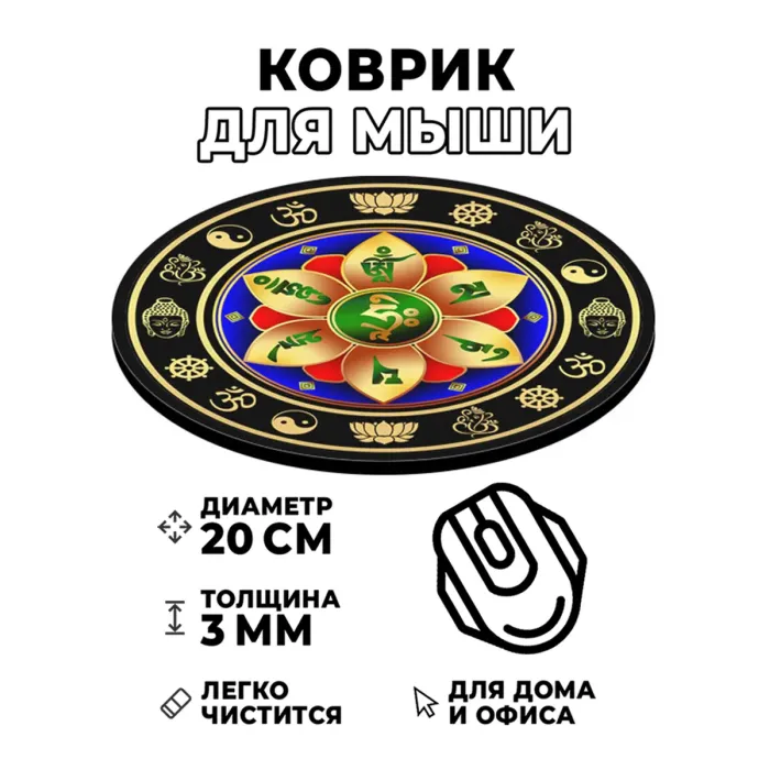 Коврик для компьютерной мыши с изображением Ом Мани Падме Хум — это не только практичный аксессуар, но и символ гармонии и благополучия. Его диаметр составляет 20 см, а толщина — 3 мм, что обеспечивает комфортное использование. Изображение на коврике отличается стойкостью, четкостью и контрастностью, что позволяет наслаждаться эстетикой во время работы или игры. Благодаря качественным материалам обеспечивается отличное скольжение мышки, что делает процесс управления более удобным и приятным. Этот коврик станет прекрасным дополнением к рабочему месту или подарком для близкого человека.