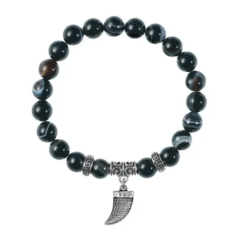 Браслет из натурального чёрного агата с подвеской в виде клыка из металлического сплава.