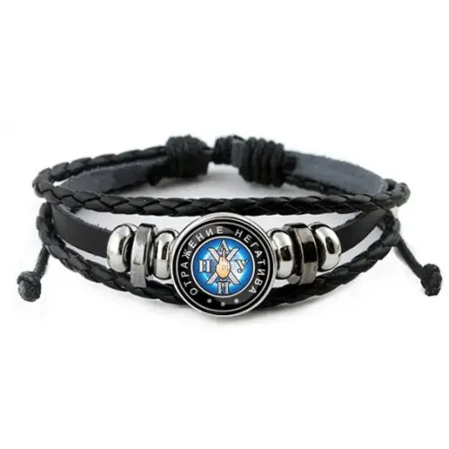 Кожаный браслет с символическим изображением под стеклянной линзой.