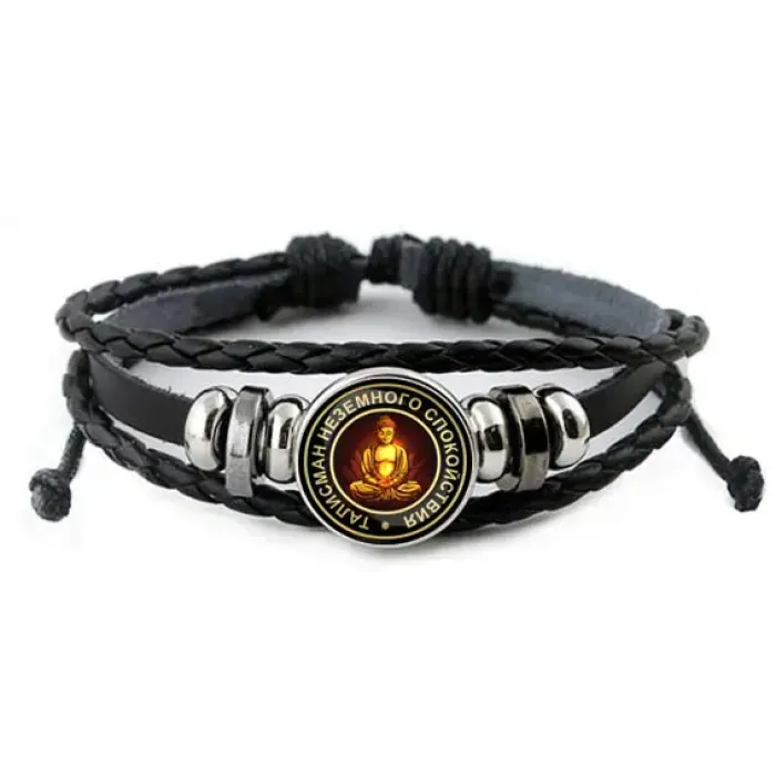 Кожаный браслет с изображением Будды. Сувенирный аксессуар с регулируемым размером.