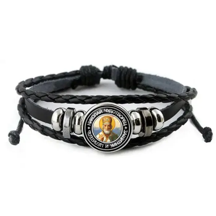 Кожаный браслет с изображением Святого Николая Чудотворца — символа помощи и защиты. Этот стильный аксессуар станет не только украшением, но и оберегом для владельца. Браслет выполнен из синтетической кожи, металла и стекла, что обеспечивает долговечность и комфорт при носке.