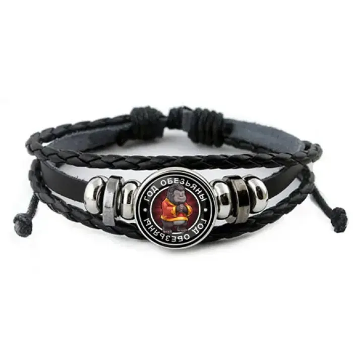 Кожаный браслет с изображением, символизирующим год Обезьяны, станет стильным аксессуаром и оригинальным подарком. Этот браслет выполнен из синтетической кожи, металла и стекла, что обеспечивает долговечность и комфорт при носке.