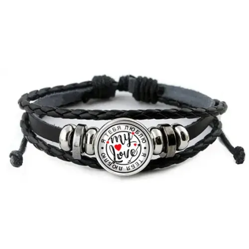 Кожаный браслет с надписью 'Я тебя люблю' станет прекрасным символом любви и привязанности. Этот стильный аксессуар выполнен из синтетической кожи, металла и стекла, что обеспечивает долговечность и привлекательный внешний вид. Изображение диаметром 20 мм защищено выпуклой стеклянной линзой, добавляя нотку элегантности. Регулируемый размер позволяет легко подстроить браслет под любой обхват запястья. Упакован в прозрачный пакет, он идеально подходит для подарка близкому человеку или для личного использования.