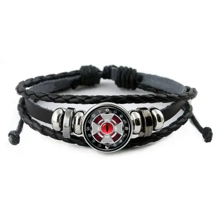 Кожаный браслет с декоративным элементом в виде креста и глаза.