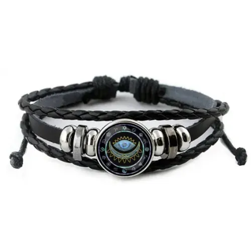 Кожаный браслет с декоративным элементом в виде глаза. Изготовлен из синтетической кожи, металла и стекла.