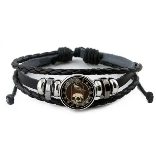 Кожаный браслет с изображением ворона на черепе — стильный аксессуар, который привносит в образ нотку загадочности и силы. Изготовлен из синтетической кожи, металла и стекла, этот браслет станет отличным дополнением к любому наряду.