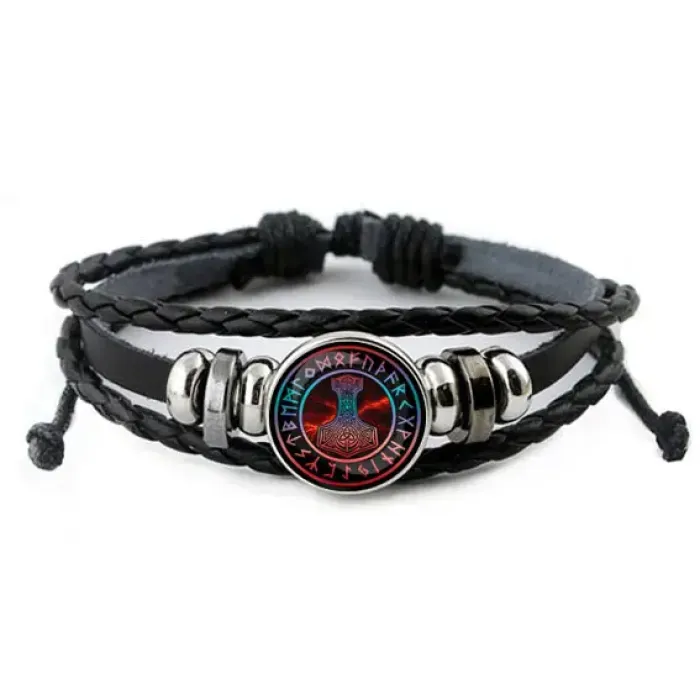 Кожаный браслет с изображением Молота Тора, символизирующим силу и защиту. Этот стильный аксессуар выполнен из синтетической кожи, металла и стекла, что обеспечивает долговечность и комфорт при ношении. Диаметр изображения составляет 20 мм, оно защищено выпуклой стеклянной линзой. Браслет имеет регулируемый размер, что позволяет легко подстроить его под обхват запястья. Упаковка представлена в прозрачном пакете, что делает его отличным подарком или сувениром для ценителей скандинавской мифологии.