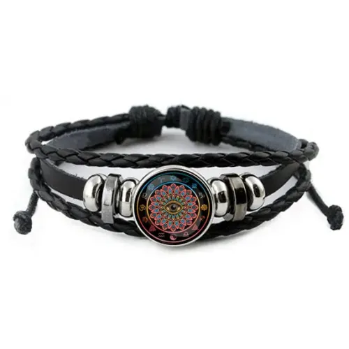 Кожаный браслет с изображением мандалы. Изготовлен из синтетической кожи и металла, оснащён выпуклой стеклянной линзой.