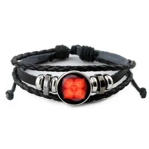 Кожаный браслет с символикой Муладхара чакры. Изготовлен из синтетической кожи, металла и стекла. Имеет регулируемый размер.
