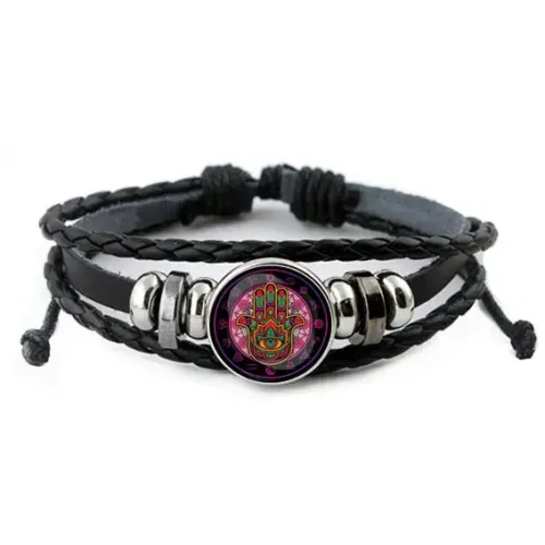 Кожаный браслет с изображением Хамсы, выполненный из синтетической кожи, металла и стекла. Изображение диаметром 20 мм расположено под выпуклой стеклянной линзой.