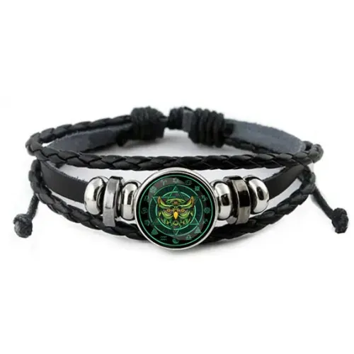 Кожаный браслет с декоративным элементом в виде совы под стеклянной линзой.