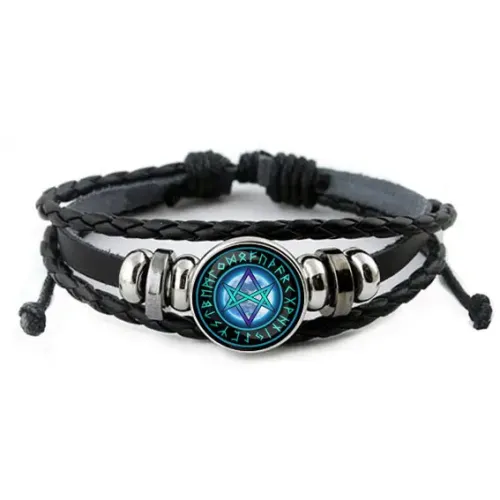 Кожаный браслет с изображением гексаграммы. Изготовлен из синтетической кожи, металла и стекла.
