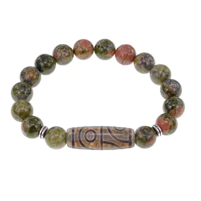 Стрейч-браслет из натурального камня унакит с тибетской бусиной Дзи из агата.