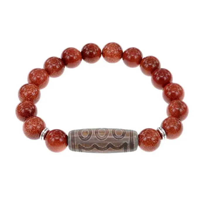 Этот стильный стрейч-браслет сочетает в себе тибетскую бусину Дзи из натурального агата и синтетический камень, имитирующий авантюрин. Пятиглазая бусина Дзи символизирует мудрость и благосостояние, а также приносит счастье своему владельцу благодаря благословению 5 Дхьяни-будд.