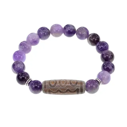 Стрейч-браслет из натурального камня, украшенный тибетской бусиной Дзи из агата. Этот уникальный аксессуар не только стильный, но и наполнен глубоким символизмом. Пятиглазая бусина Дзи считается источником мудрости и благосостояния, а её сила помогает в достижении желаемого и приносит счастье. Аметист, используемый в браслете, известен своим воздействием на гармонию и мир в душе, защищая от негативных мыслей и конфликтов.