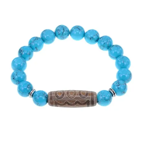 Стрейч-браслет из синтетического камня, имитирующего бирюзу, с тибетской бусиной Дзи из натурального агата.