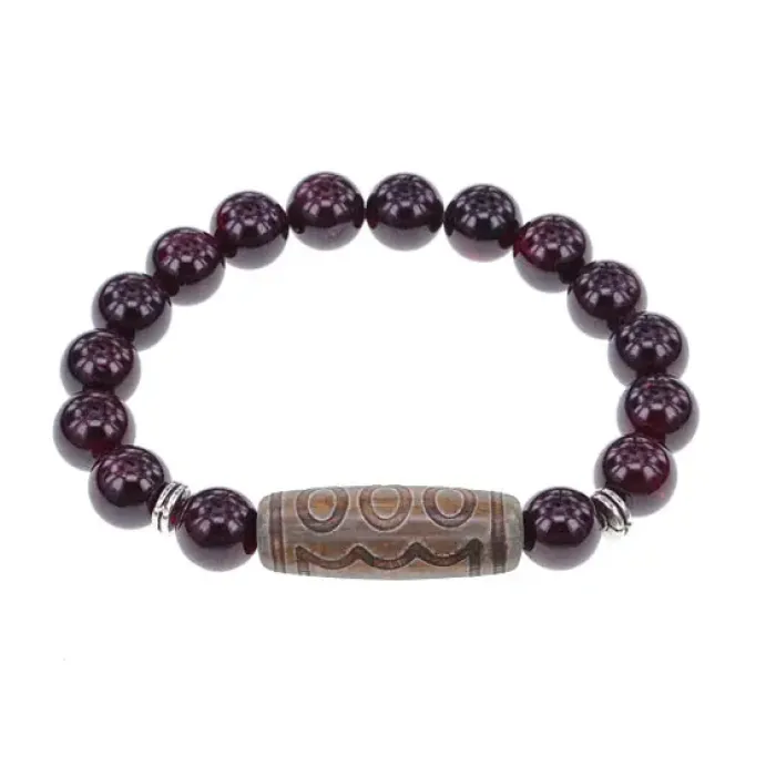 Стрейч-браслет из натурального камня граната с тибетской бусиной Дзи из агата.