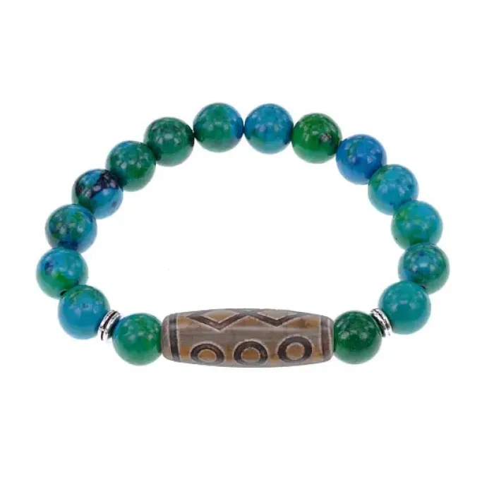 Стрейч-браслет из синтетического камня, имитирующего хризоколлу, с тибетской бусиной Дзи из натурального агата.