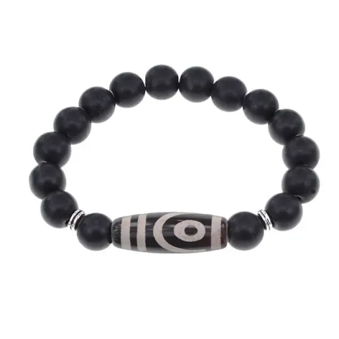 Стрейч-браслет из синтетического камня, имитирующего шунгит, с тибетской бусиной Дзи из натурального агата.
