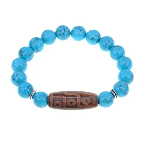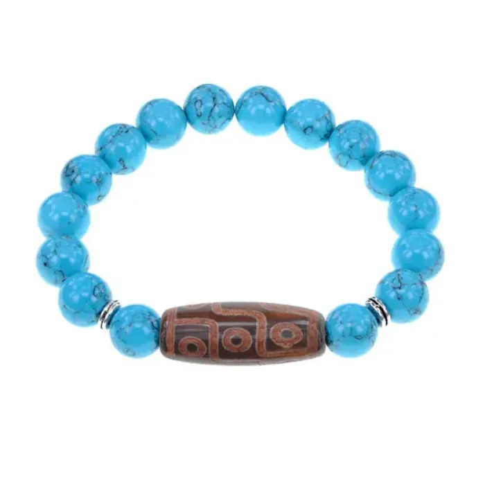 Стрейч-браслет из синтетического камня, имитирующего бирюзу, с тибетской бусиной Дзи из натурального агата.