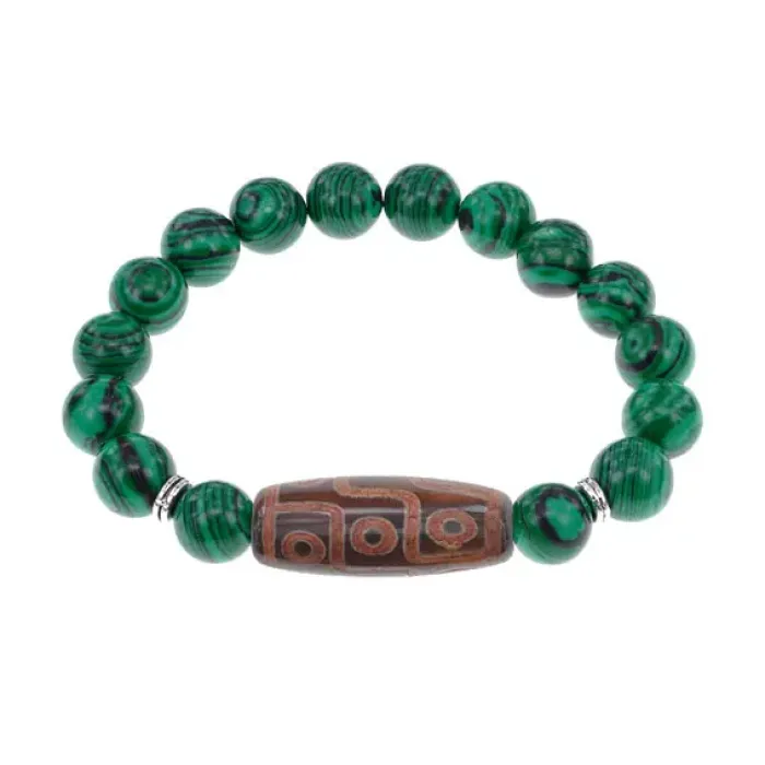 Стрейч-браслет из синтетического камня малахит с тибетской бусиной Дзи из натурального агата.