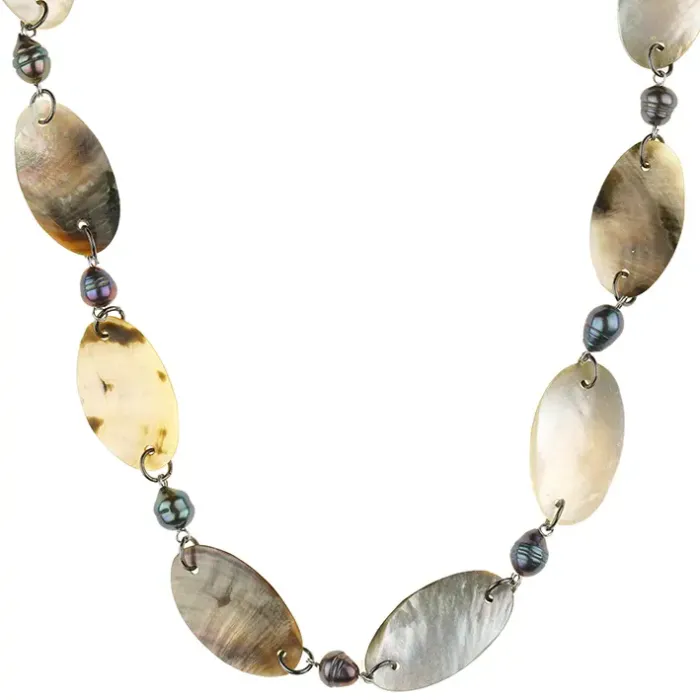 Колье из пластин и жемчуга UG064 — это стильное украшение, которое сочетает в себе элегантность и современный дизайн. Изготовлено из бижутерного сплава, перламутра и натурального жемчуга, оно станет прекрасным дополнением к любому образу.