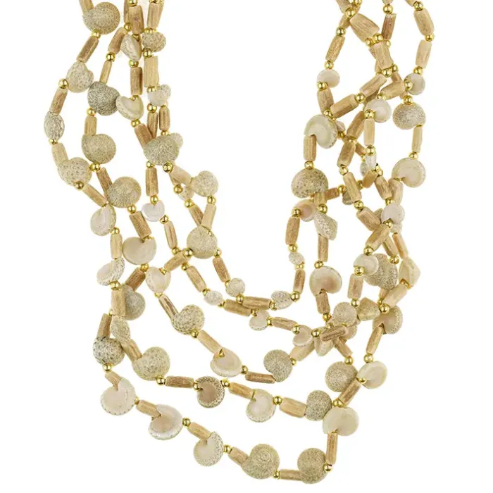 Колье Ракушки и бусины UG076 — это изысканное украшение, которое привносит в образ нотки морской романтики. Сочетание бижутерного сплава, дерева и перламутра создает уникальный стиль, а покрытие под золото придаёт изделию благородный вид.