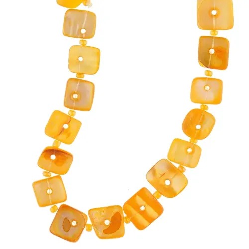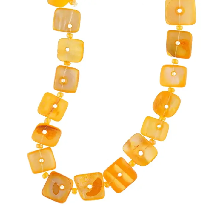 Колье из квадратных пластинок оранжевого цвета, изготовленное из бисера и перламутра.