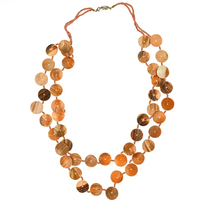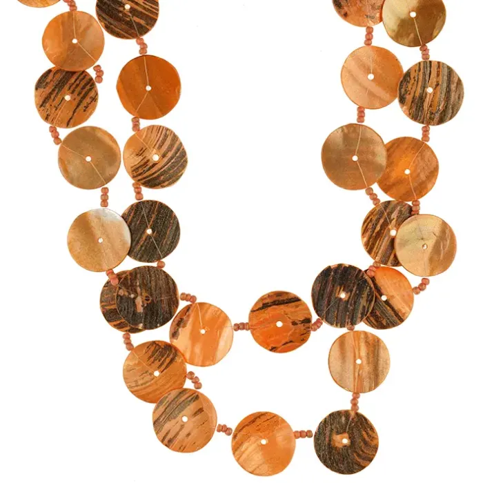 Колье из дерева и перламутра с пластинами и бусинами оранжевого цвета.