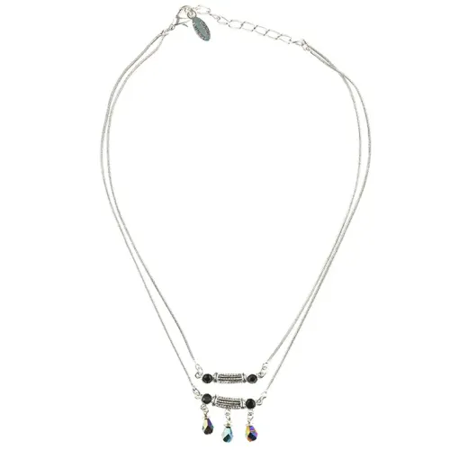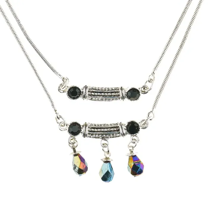 Бижутерное колье синего цвета для ношения в качестве аксессуара. Изготовлено из сплава с серебристым покрытием, декорировано стразами и камнями.