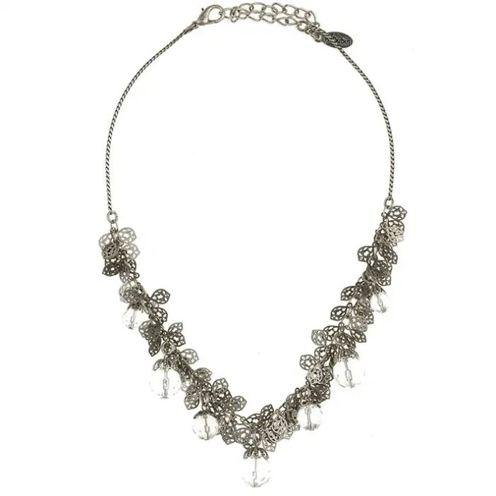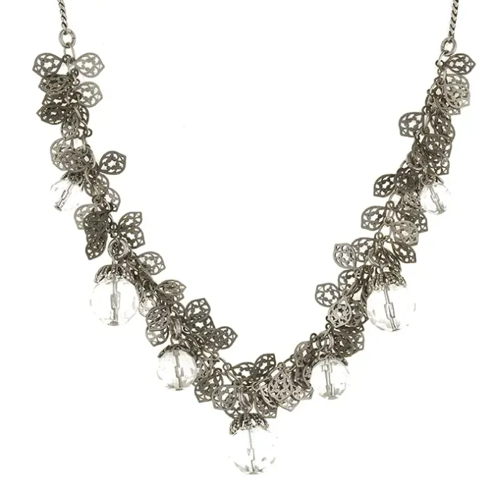 Бижутерное колье с элементами в виде листьев и вставками из кристаллов в белом цвете.
