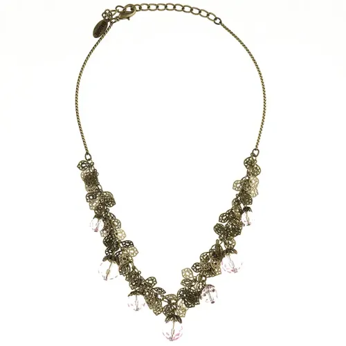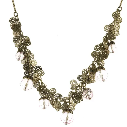 Бижутерное колье для носки, выполненное в розовом цвете с элементами в виде кристаллов и листьев.