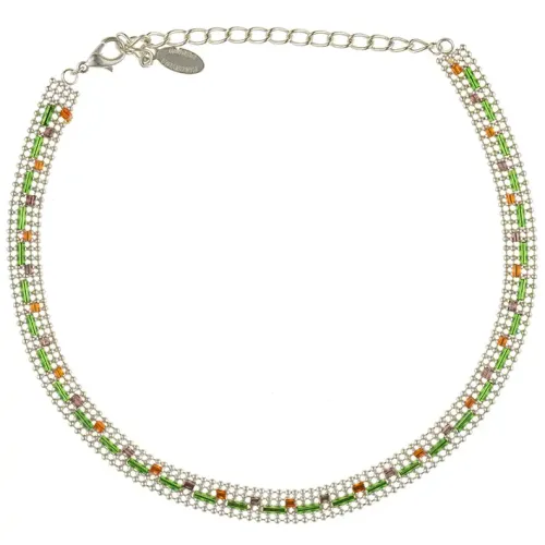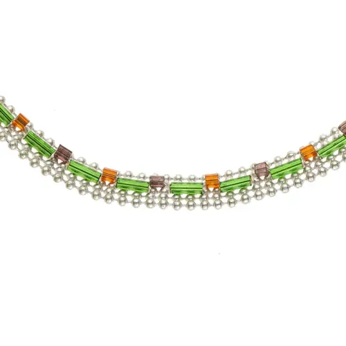 Чокер из бижутерного сплава и разноцветного бисера с серебристым покрытием.