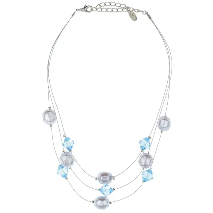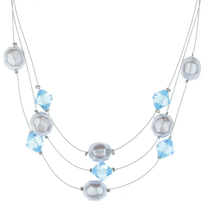 Бижутерное колье для ношения на шее, состоящее из искусственного жемчуга и кристаллов голубого цвета.
