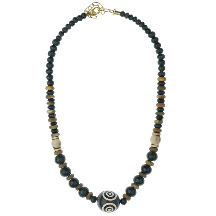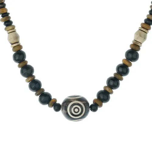 Колье из бижутерного сплава и дерева с элементами в виде шариков и бусин.