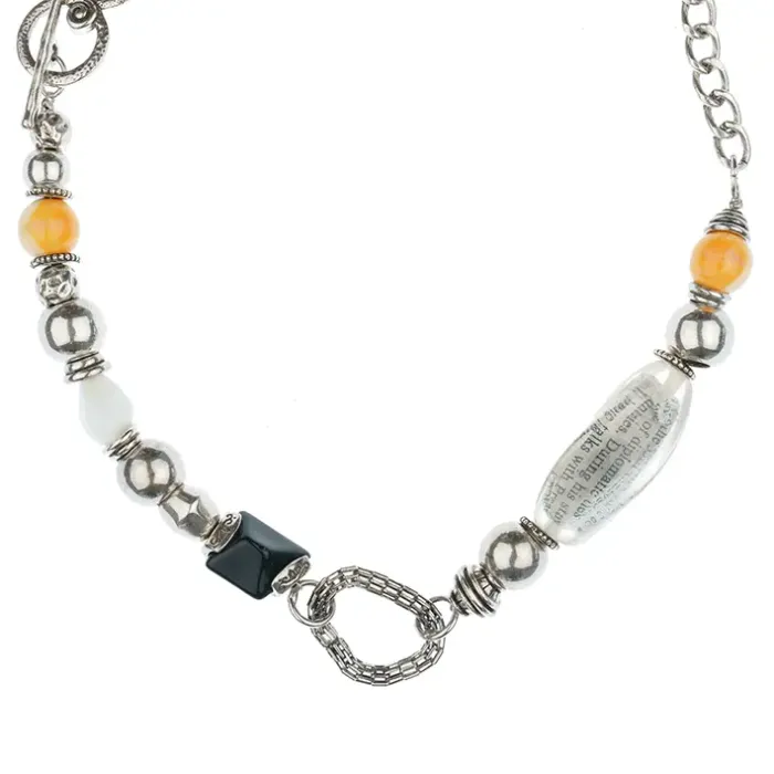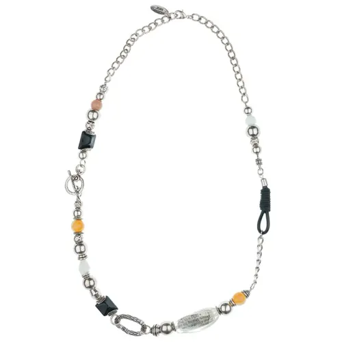 Колье из бижутерного сплава с элементами из искусственных камней и кожи.