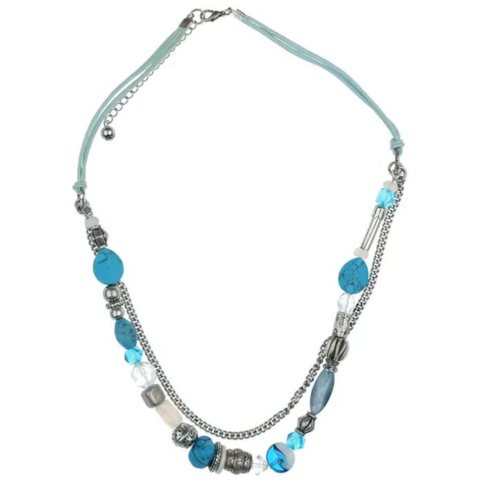 Колье из бижутерного сплава с элементами искусственного перламутра, камней и кожи.