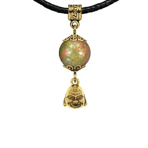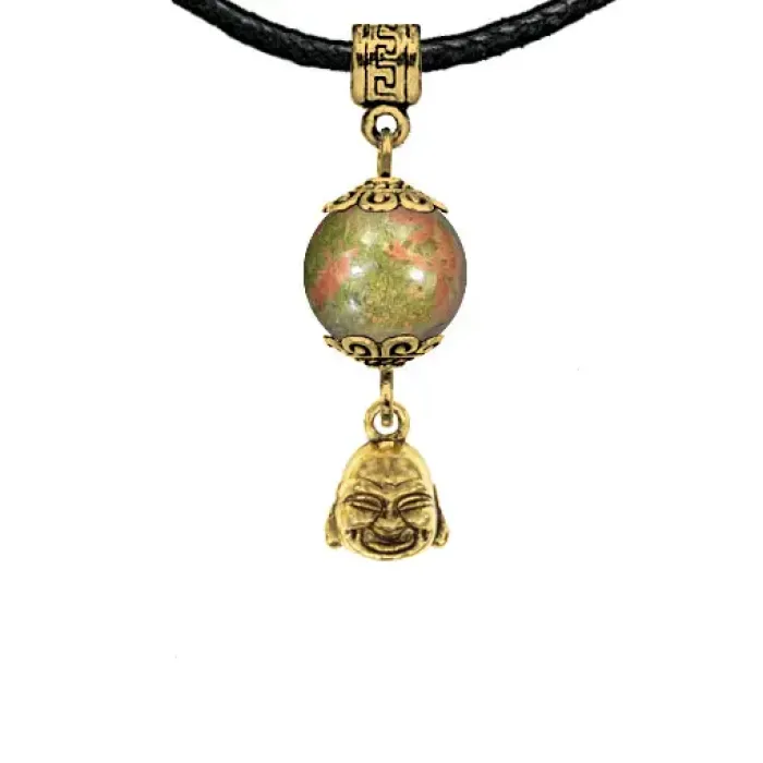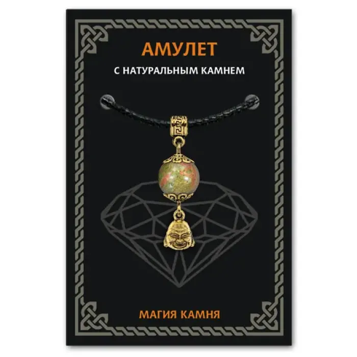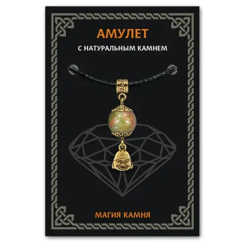 Амулет 'Бог богатства' из натурального унакита символизирует изобилие и благополучие, а также служит защитой от неприятностей. Этот уникальный аксессуар помогает развивать гармонию, любовь и знания, поддерживая сердечную чакру. Изготовленный из бижутерного сплава с покрытием под золото, амулет дополнен натуральным камнем и упакован в прозрачный пакет с европодвесом. В комплект входит чёрный ХБ шнурок для удобства ношения. На обратной стороне вкладыша указано наименование камня, а также краткие описания значений всех камней и подвесок-талисманов коллекции 'Магия камня 2'.