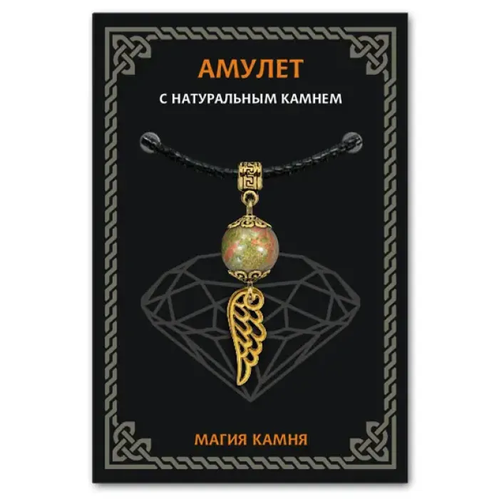 Амулет "Крыло ангела" с натуральным камнем унакит символизирует защиту высших сил и гармонию. Он традиционно используется для развития любви, знаний и решения жизненных проблем. Изготовленный из бижутерного сплава с покрытием под золото, он сочетает в себе элегантный дизайн и мощную энергетику. В комплект входит черный ХБ шнурок, а также вкладыш с описанием значений камней и подвесок-талисманов. Уникальный амулет упакован в прозрачный пакет с европодвесом, что делает его отличным подарком или элементом личной защиты.