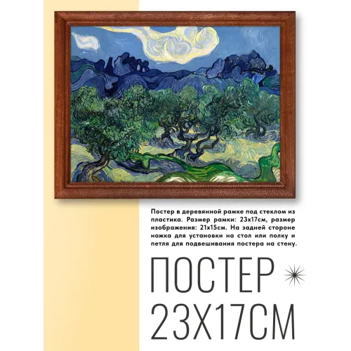 Постер в рамке с репродукцией картины Винсента Ван Гога "Оливковые деревья" (1889) станет стильным акцентом в любом интерьере. Эта работа известного художника, выполненная в ярких и насыщенных цветах, символизирует гармонию природы и вдохновение. Основные особенности: