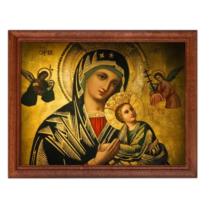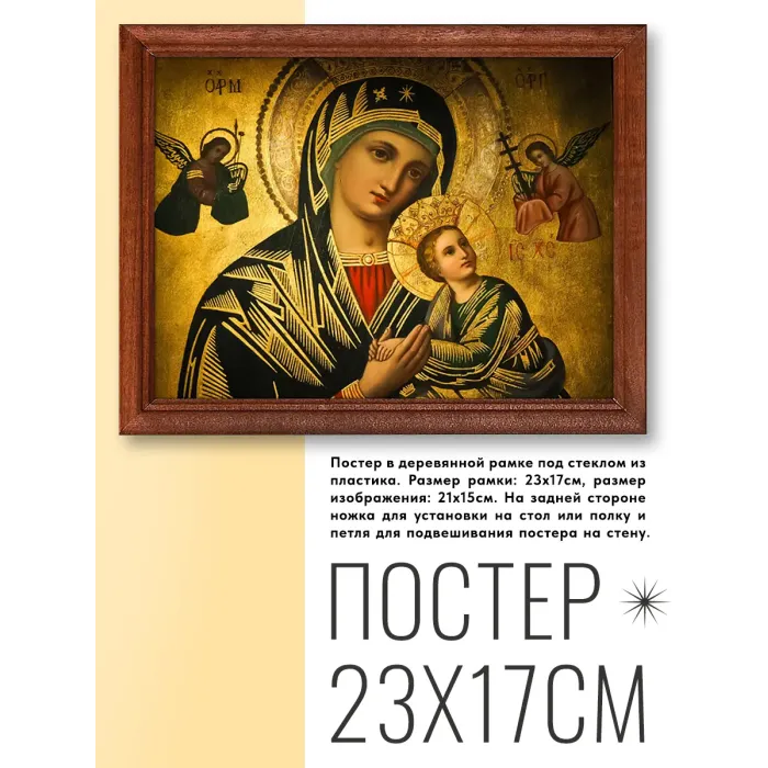 Постер в рамке «Богородица с младенцем» — это стильное украшение, которое привнесет атмосферу уюта и духовности в любое пространство. Репродукции икон, выполненные в деревянной рамке под пластиковым стеклом, идеально подходят для декорирования салонов, магазинов, офисов и жилых помещений.