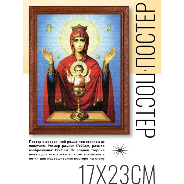 Постер в рамке «Неупиваемая Чаша» — это стильное и значимое украшение для интерьера, которое привнесет атмосферу уюта и духовности. Репродукция иконы выполнена в деревянной рамке с пластиковым стеклом, что обеспечивает надежную защиту изображения.