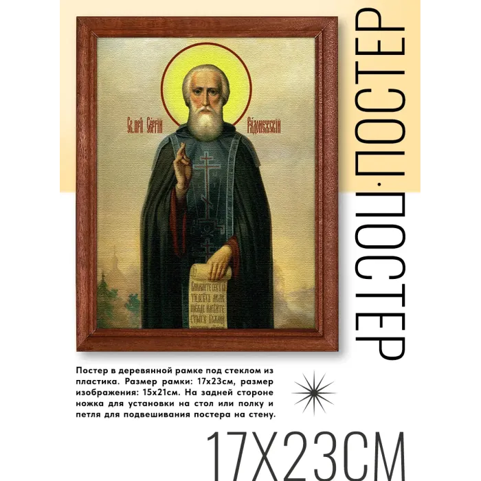 Постер в рамке с изображением святого Сергия Радонежского — это не только элемент декора, но и символ духовности и веры. Он идеально подходит для украшения интерьеров салонов, магазинов, офисов и кафе.