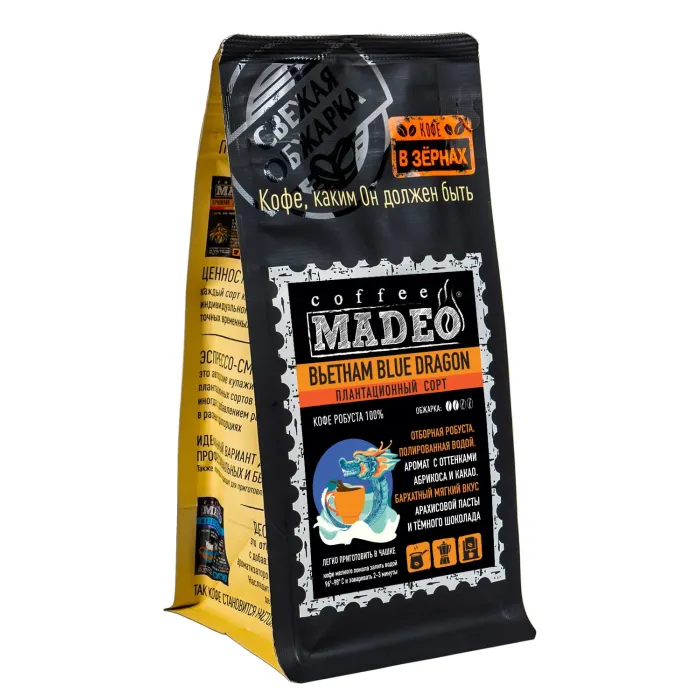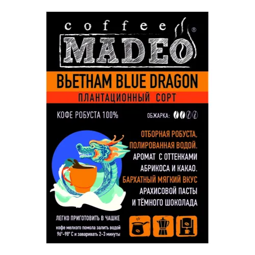 Кофе в зернах Madeo Вьетнам Blue Dragon — это плантационная робуста, известная своей уникальной обработкой полированием водой. Этот кофе из Вьетнама отличается сладким ароматом с нотками абрикоса и какао.
