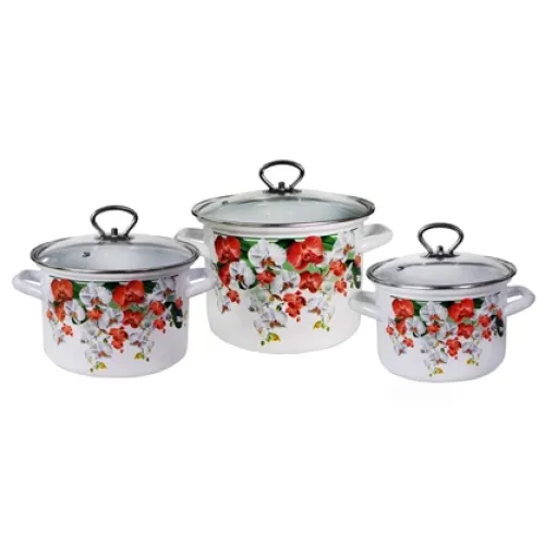 - Материал: эмалированная сталь- Количество предметов в наборе: 3 (кастрюли)- Объём кастрюль: 2.4 л, 3.4 л, 5.0 л- Конструкция крышек: стекло с металлическими ручками- Совместимость: все виды плит (газовые, электрические, стеклокерамические, индукционные)- Особенности ухода: эмалированная поверхность легко очищается