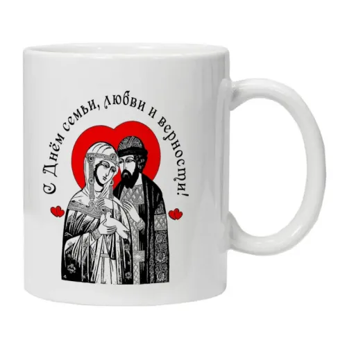 Кружка изготовлена из керамики, материала, устойчивого к высоким температурам. На поверхность нанесено декоративное изображение, посвящённое тематике дня семьи, любви и верности. Конструкция включает удобную ручку для комфортного использования.