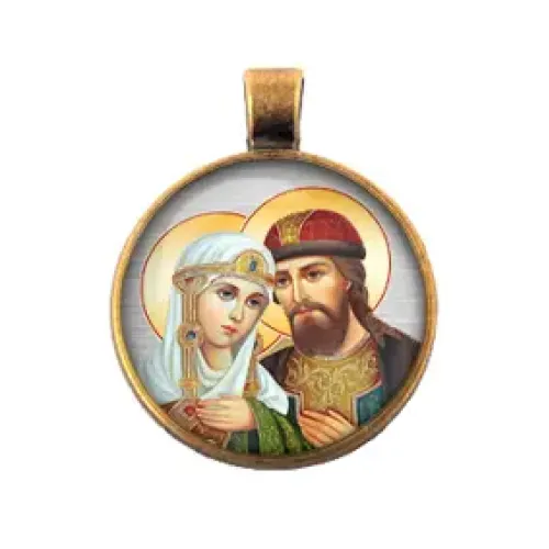 Кулон Пётр и Феврония — это символ любви и семейного счастья. Изготовленный из бижутерного сплава с покрытием под бронзу, он станет прекрасным дополнением к любому образу. Диаметр кулона составляет 28 мм, что делает его заметным аксессуаром. В комплект входят чёрный шнурок с застёжкой, вкладыш и этикетка с описанием. Традиционно считается, что изображение святых помогает в обретении гармонии в семье и преодолении трудностей.