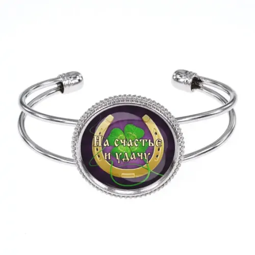 Браслет-сувенир из бижутерного сплава с покрытием под серебро и стеклянной линзой.
