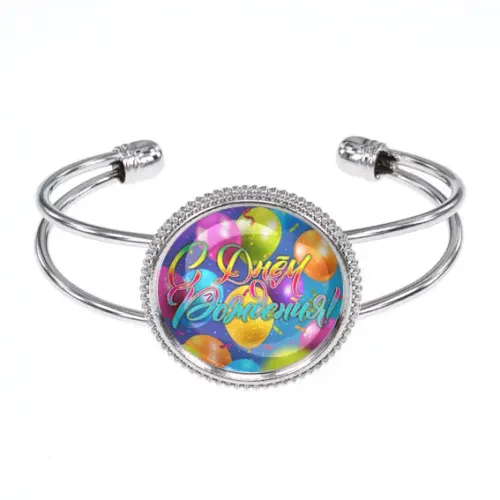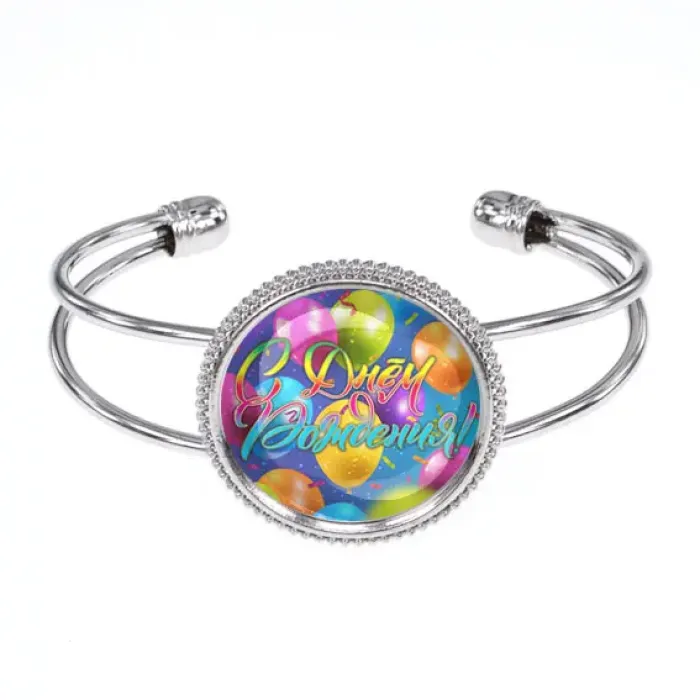 Этот браслет с поздравлением "С Днём рождения!" станет замечательным подарком для близкого человека. Изготовленный из бижутерного сплава с покрытием под серебро, он привлекает внимание своим стильным дизайном и ярким изображением диаметром 25 мм, защищенным выпуклой стеклянной линзой. Удобный открытый формат позволяет носить его без ограничения по размеру. Каждый браслет упакован в прозрачный пакет, что делает его идеальным для подарка в любой момент. Такой аксессуар не только украсит образ, но и создаст атмосферу праздника.