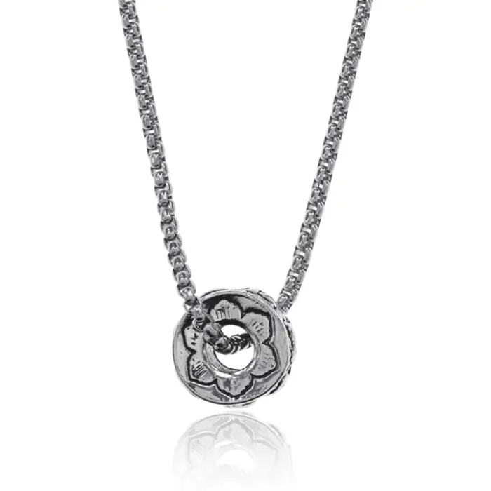 Амулет в виде молитвенного барабана на цепочке. Изготовлен из металла с покрытием под серебро.